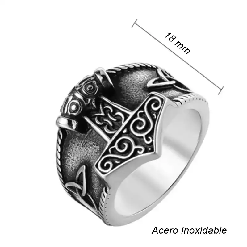 Lleva contigo el poder de Thor y la sabiduría celta con este impresionante anillo vikingo de acero inoxidable. El martillo de Thor (Mjölnir) y el símbolo triqueta están bellamente grabados en acero inoxidable de alta calidad, lo que lo convierte en una pieza duradera y elegante. Perfecto para hombres y mujeres que buscan un símbolo de fuerza, protección y equilibrio.