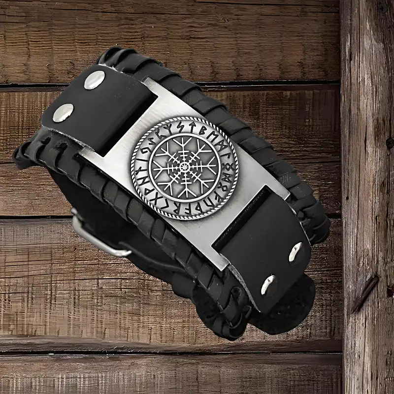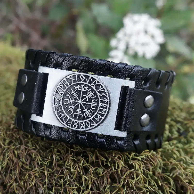 Pulsera de cuero Vegvisir con runas vikingas – Fortaleza y protección