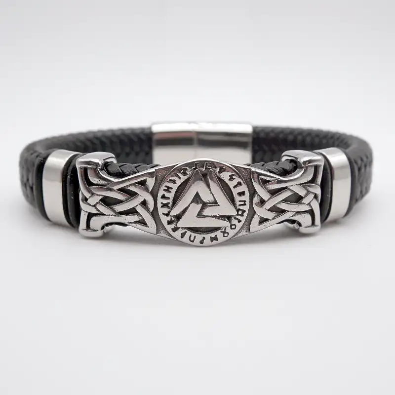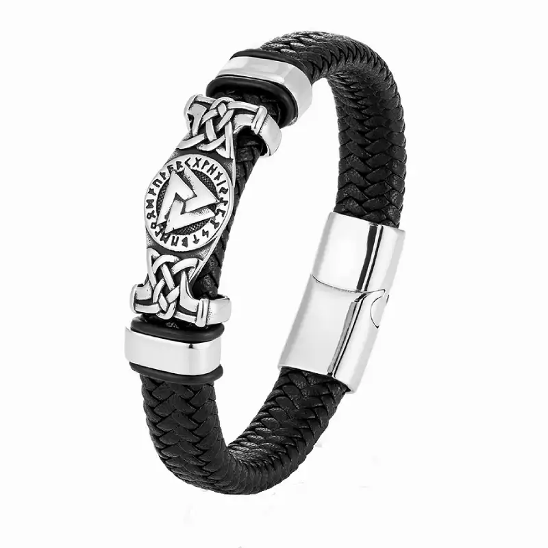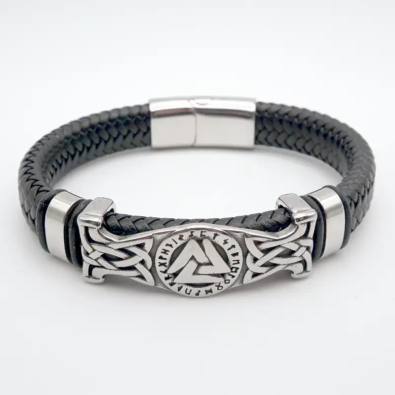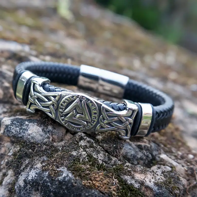 Adéntrate en la historia y la tradición vikinga con nuestra exclusiva pulsera de cuero y acero Valknut, donde la artesanía y el simbolismo se entrelazan de manera sublime.